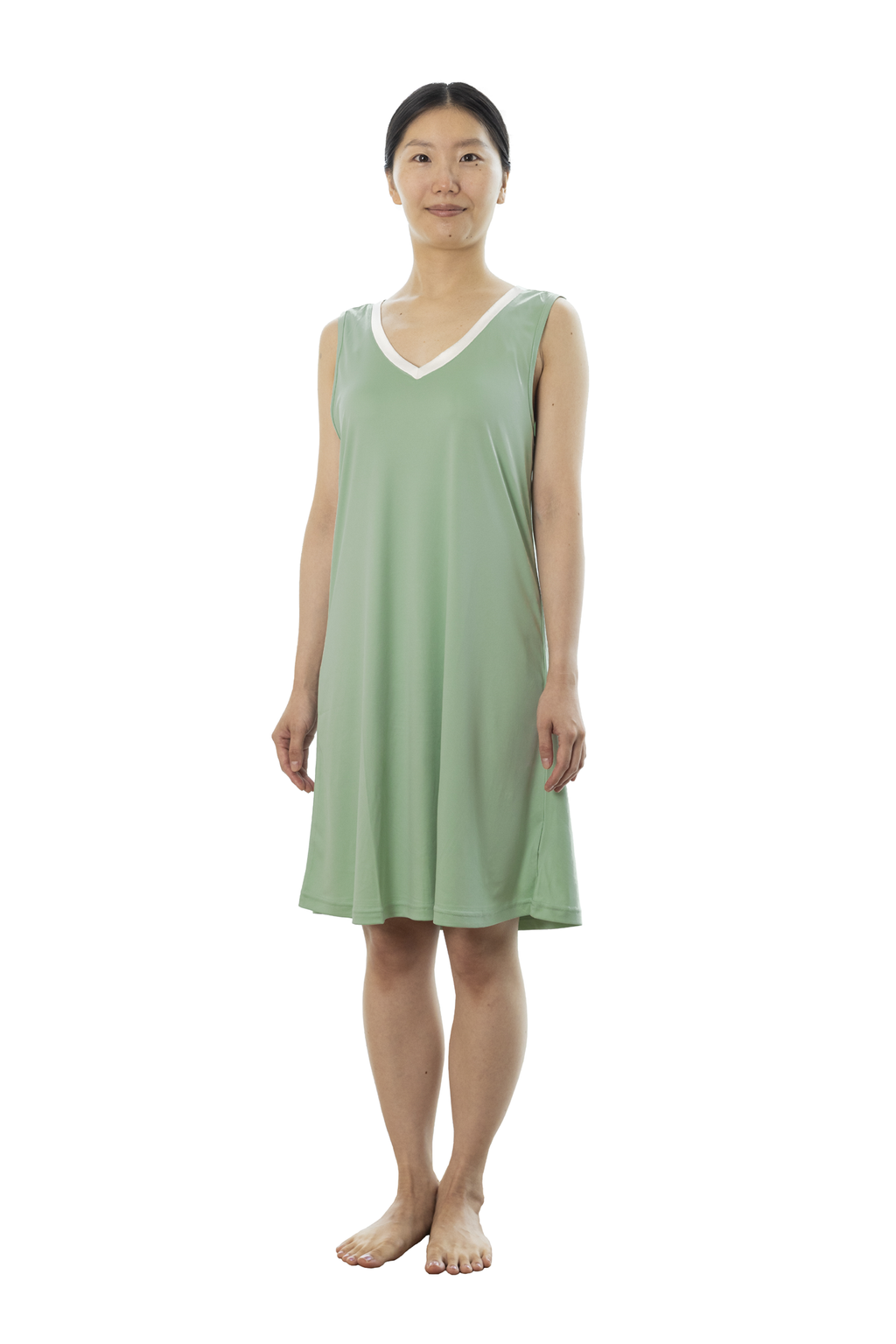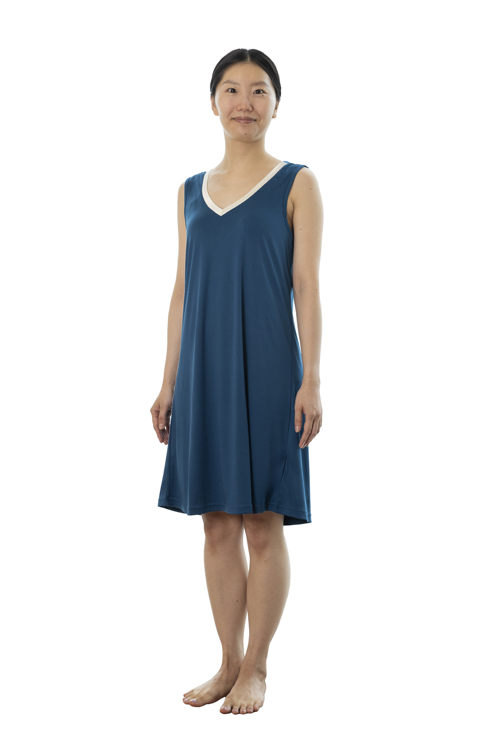 シンプルで可愛らしいデザインのライトウェイトなレディース ネグリジェナイティ。サテンのトリム付きのノースリーブ Vネックスタイル。スリムフィット。